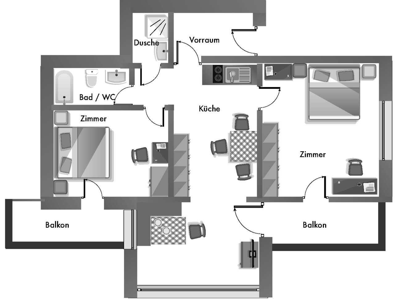 Ausstattung: 2 getrennte Schlafzimmer, Wohnbereich, Küche & Essplatz, Bad mit Dusche/WC, Balkon. Für 2–4 Personen geeignet