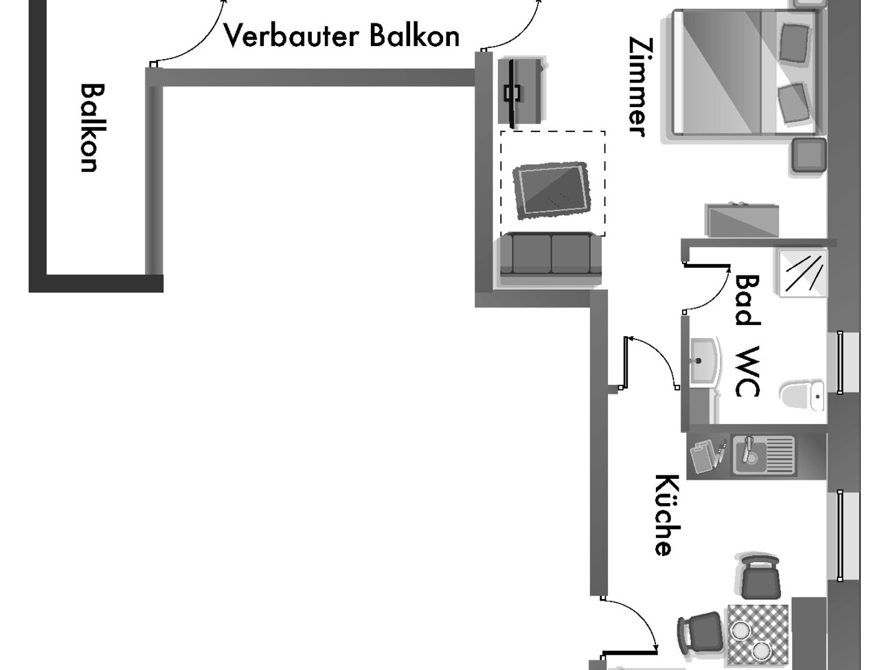 Ausstattung: 1 Schlafzimmer, Wohnraum, Küche & Essbereich, Badezimmer mit Dusche/WC, Balkon. Für 2–3 Personen geeignet