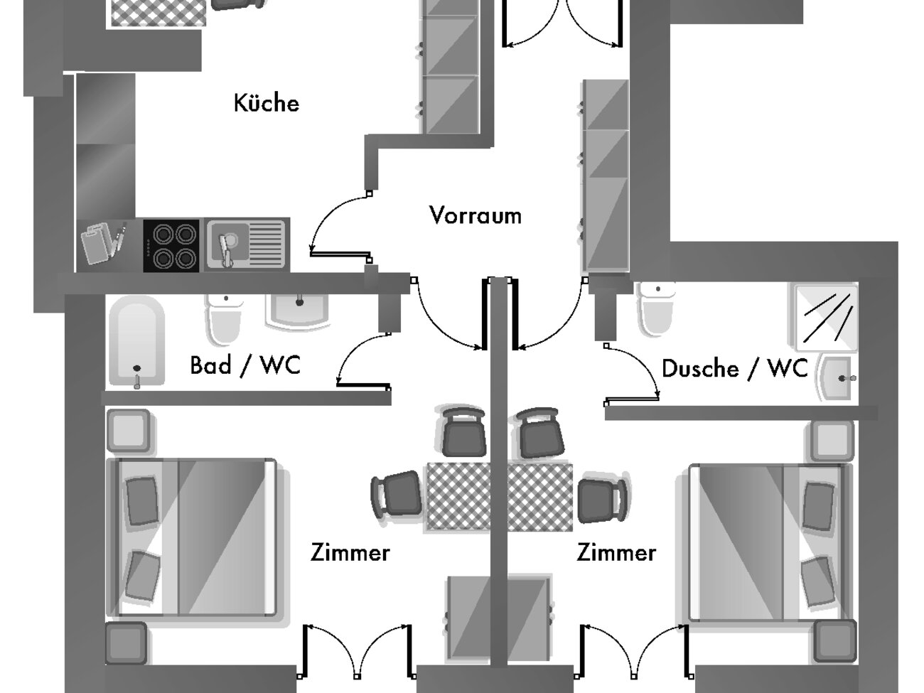 Ausstattung: Zwei getrennte Schlafzimmer, Wohnraum, Küche & Essplatz, 2 Badezimmer mit Dusche/WC bzw. Badewanne/WC. Für bis zu 4 Personen geeignet